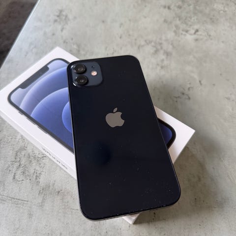 Apple iPhone 12 smartphone med 128 GB lagerplads i sort. Den virker helt fint, har dog enkelt brugstegn på bagsiden og siden af telefonen. Nulstillet og klar til at blive sendt.