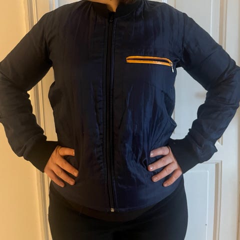 Mads Nørgaard quiltet jakke i størrelse 38. Jakken er blå og lavet af polyester. Den har en quiltet overflade og et mønstret for i polyester.