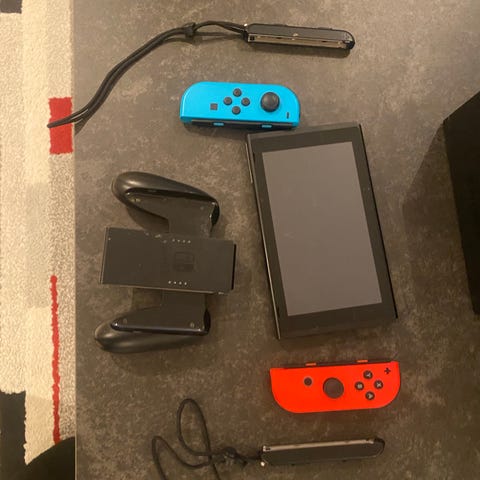 Nintendo Switch spillekonsol med tilhørende Joy-Con controllere i rød og blå farve. Konsollen har en skærm til håndholdt spil og kan tilsluttes dockingstation for TV-spil.