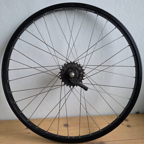 Baghjul 26 x 1,75 til 8-9 og 10 speed. Sort aluminiumsfælg med 36 rustfri stål‑eger. Hjulet er til fælgbremse og har kun været brugt meget lidt. Nypris: 649 kr.