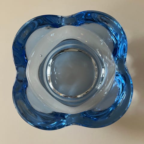 15x15 cm med hanke 19,5 cm, jde ca 10 cm, flot i blå nuancer