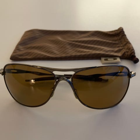 Oakley solbriller til mænd, Polaroid, med mørke brunlige glas og sort stel. Brillerne leveres med original opbevaringspose. Fra ikke ryger hjem, ingen dyr.
