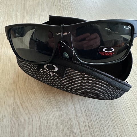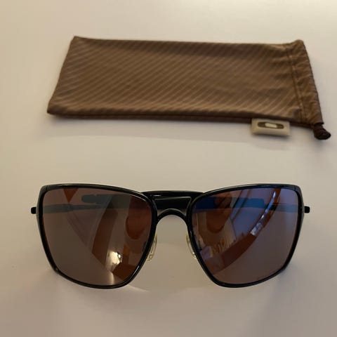 Oakley herre solbriller, Polaroid, med mørke brunlige glas. Solbrillerne har en flot kobber farvet metalramme og medfølgende original stofpose til opbevaring. Fra ikke ryger hjem, ingen dyr.