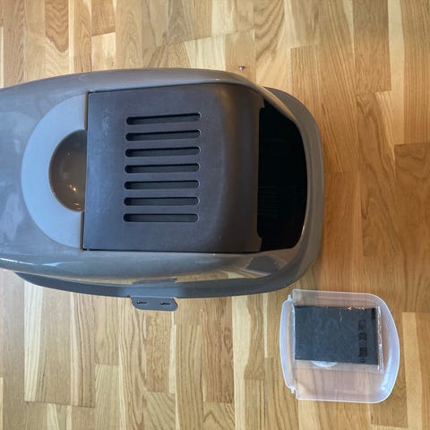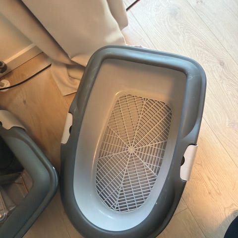 Trixie kattebak med låg og klaplåge i farverne grå og hvid. Kattebakken er designet til at give katten privatliv og reducere lugt. Den har en klaplåge, som gør det nemt for katten at komme ind og ud. Materialet er plast, og bakken er egnet til brug for katte.
