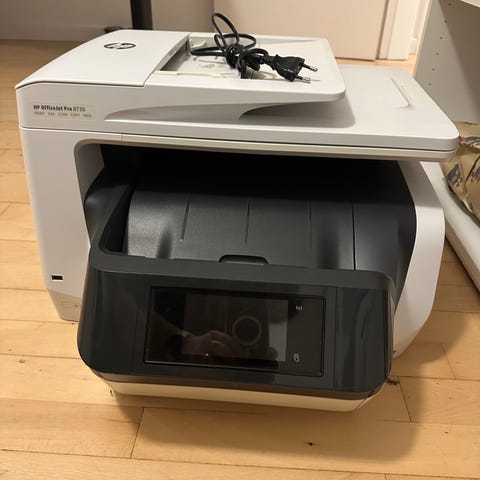 HP OfficeJet Pro 8600 Plus printer i hvid og sort farve. Printeren har et integreret display og understøtter trådløs tilslutning. Velegnet til kontorbrug med multifunktionelle printmuligheder.