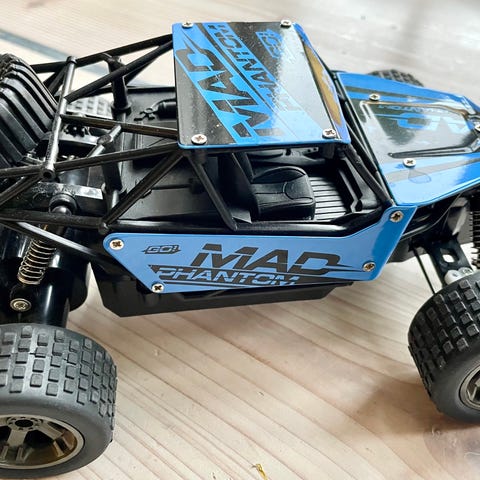 Mini Cooper radiostyret bil i rød og hvid farve med en længde på 15,5 cm. Bilen er en modelbil med fjernbetjening, velegnet til fjernstyret kørsel.