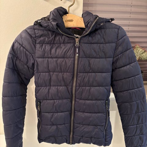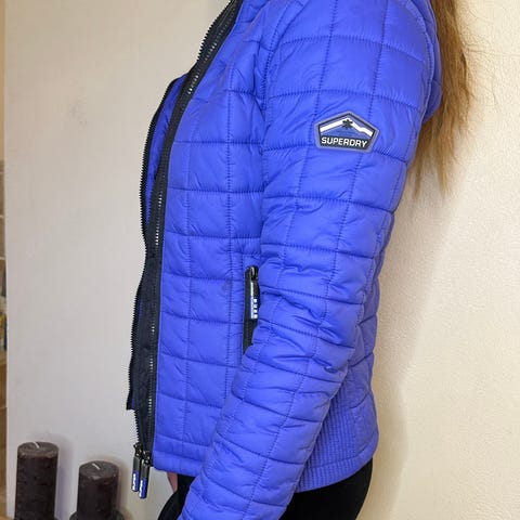 Superdry Gsosgr150 anden jakke i blå farve, størrelse L til kvinder, fremstillet i polyester. Jakken har hætte og lommer, og er designet til at give beskyttelse mod vind og vejr.