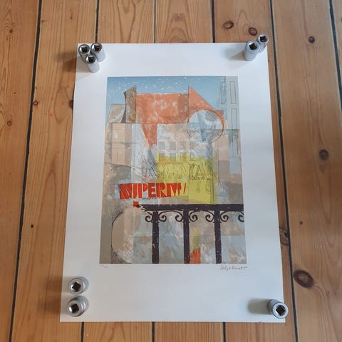 Finurligt og specielt farvelitografi af Hardy Ernst