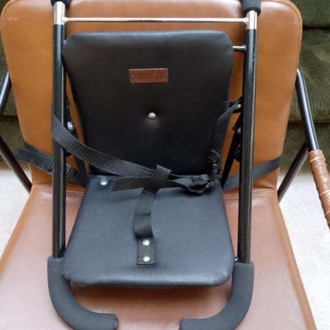 Smart barnestol som kan bruges på farten. Kan klappes sammen og nemt haves med i bilen eller under klapvogn/barnevogn. Monteres nemt på voksenstol.