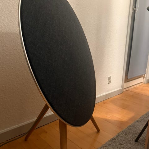 Bang & Olufsen Beoplay A9 højttaler med rund form og beige stofbetræk. Højttaleren har et unikt design med tre ben i træ og er velegnet til brug i stuer eller større rum. Materialerne inkluderer tekstil og træ, og produktet er designet til at levere høj lydkvalitet.
