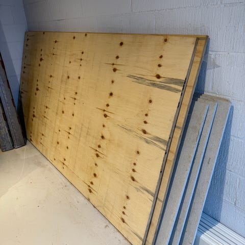 Sælger en bunke 12 mm krydsfinerplader i blandede størrelser.