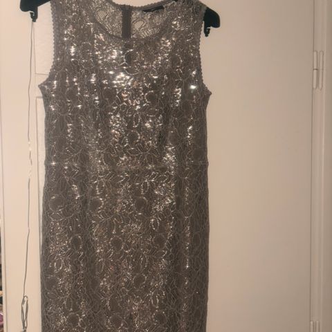 Flot feminin kjole i sort blonder med lange ærmer og lynlås på ryggen. Står størrelse 14, som vist svarer til str 42. Virkelig smuk kjole