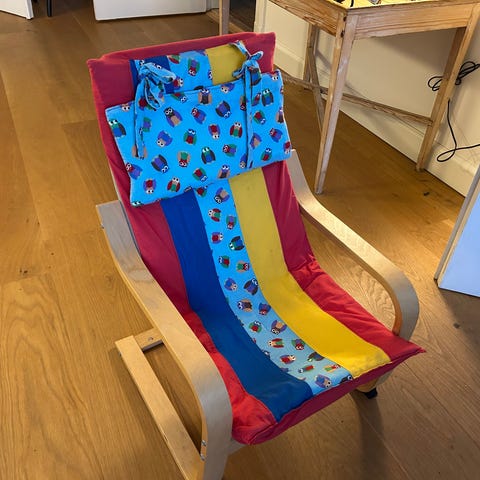 IKEA børnestol i lyst træ med herligt stofbetræk. Stolen har en buet træramme og ryg for komfort. Velegnet til børn og kan bruges til afslapning eller leg.