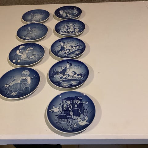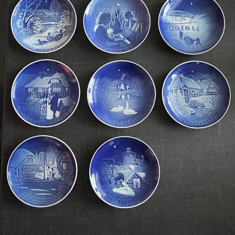 Bing & Grøndahl Juleplatte sæt bestående af 7 stk. porcelænsplatter med blå og hvide motiver. Hver platte har et unikt julemotiv og årstal. Platterne er designet til samling og dekoration.