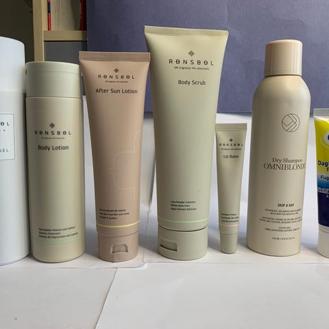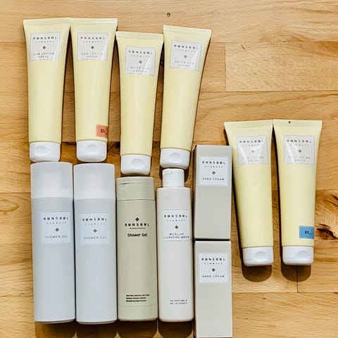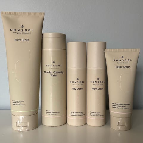 Rønsbøl hudplejesæt bestående af shower gel, body lotion, hand cream og micellar cleansing milk. Produkterne har forskellige størrelser og emballage i tube og flaske. Sættet indeholder plejeprodukter til kroppen og hænderne.
