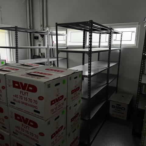 14 stk. stålreoler med fem hylder i hver (har flere løse hylder).