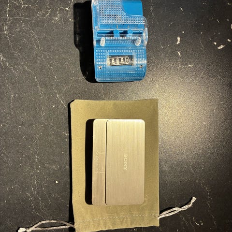 Kameraet sælges med godt batteri og oplader, engelsk brugsanvisning, CD rom, det sjældne (og dyre) originale Sony kabel til overførsel af billeder samt original emballage.