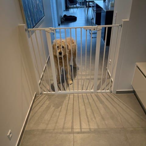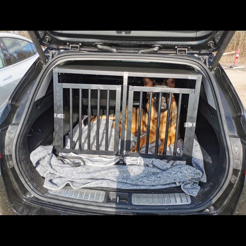 hundelåge med døre som er udstyret med gasdæmper og er låsbare.