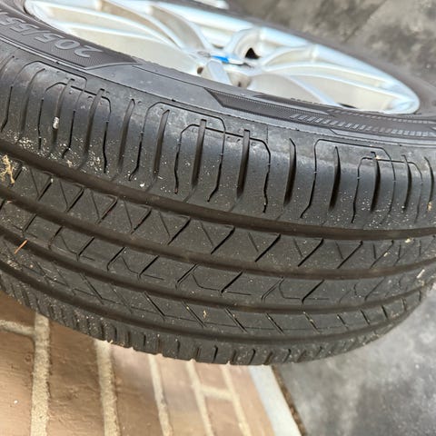 Fælgene er i god stand og fremstår pæne med normale brugsspor. Dækkene har stadig fornuftigt mønster og er klar til brug.