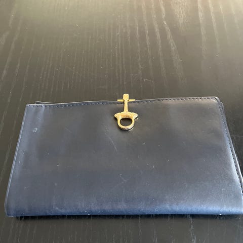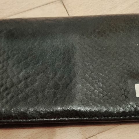 Fin pung i sælskind og sort læder med flere rum inklusiv kortlommer og lynlåsfunktioner.