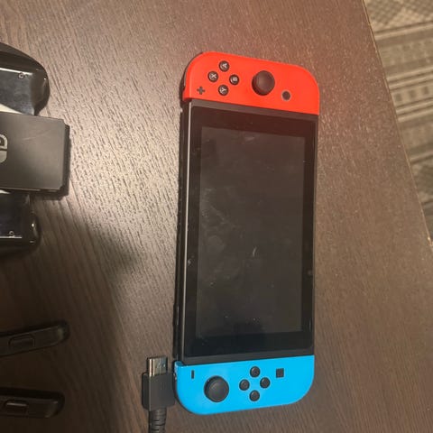 Nintendo Switch spillekonsol med tilhørende Joy-Con controllere i blå og rød farve. Inkluderer dock til tilslutning til TV, oplader og tilbehør såsom håndledsremme og kontrollerholder. Konsollen kan bruges til både håndholdt spil og tilslutning til større skærm via dock.