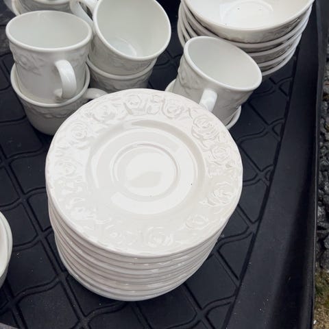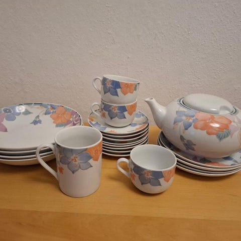 Rörstrand stellet middagsservice med blomsterdekor. Servicen består af tallerkener, kopper og skåle med et mønster af orange og blå blomster på hvid porcelæn. Designet er klassisk og velegnet til daglig brug eller særlige lejligheder.