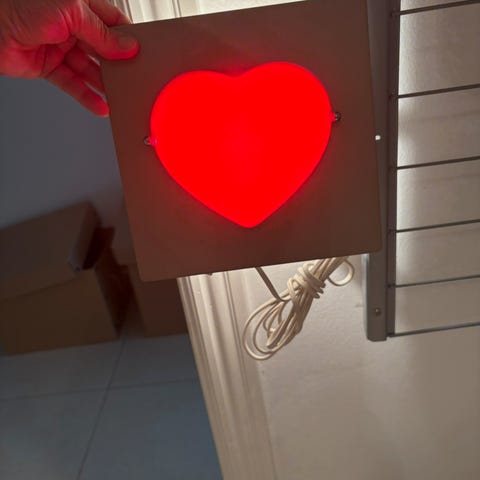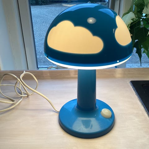 Den ikoniske hjerte lampe fra 1990'erne. Lampen er kendt som en "pop art" eller "Y2K" stil, og har en "smeltet popcorn" tekstur i plastikken og en spiralformet krombase. måler ca 26 cm. I højden. Den har lidt aldersbetinget patina i form af en smule rust på stellet / basen helt yderst (se billede tæt på). Lampen er ellers i hel og pæn stand, og fungerer som den skal - giver det hyggeligste lys - helt perfekt til pigeværelset.