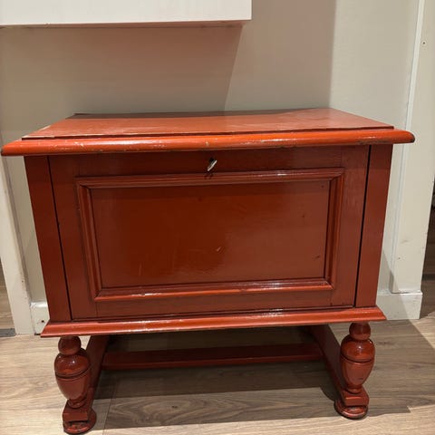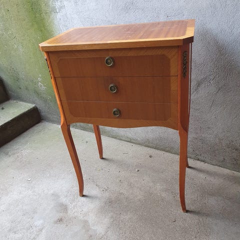 Skuffemøbel med tre skuffer, dekorative beslag og buede ben. Fint gammelt møbel,Afhentes i:,Røde Kors Tuborgvej / København NV (101),Bemærk at mail, chat og beskeder ikke besvares, og varen skal købes på knappen "Gå til varen"