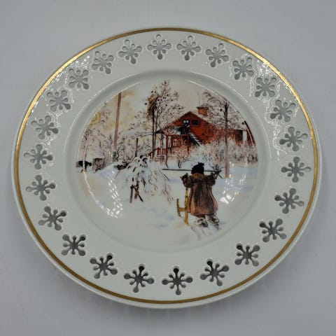 Kagedisken er dekoreret med detaljerede motiver og en guldkant. Den er lavet af porcelæn. Bing & Grøndahl No.726,Afhentes i:,Røde Kors Roskilde (265),Bemærk at mail, chat og beskeder ikke besvares, og varen skal købes på knappen "Gå til varen"