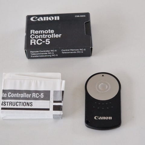 Canon WL-51 trådløs fjernbetjening med flere knapper til funktioner som optagelse, afspilning, stop, spoling og stillbillede. Enheden er sort og batteridrevet, designet til brug med kompatible Canon-enheder.