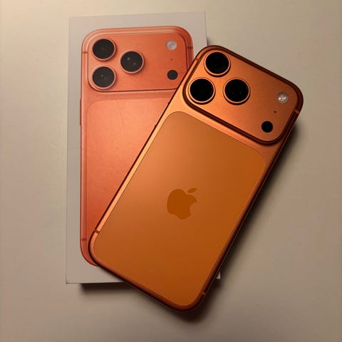 Apple iPhone 17 Pro Max & 17 17 Pro mobiltelefon med 512 GB & 1000GB lagerplads. Enheden har et kamera med flere linser og en farve i orange. Designet til brugere, der søger avancerede funktioner og stor lagringskapacitet.