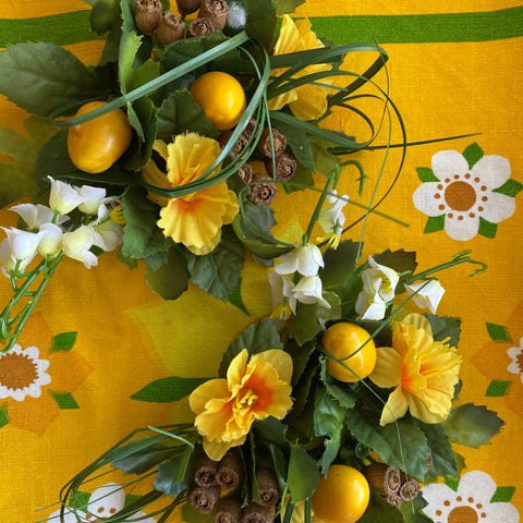 Retro /vintage lyskranse. Påske /forår., Retro /vintage lyskranse. Påskeliljer /andre, 2 x lyskranse i gammeldags plast. ( altså 2 x 2) Ægte retro /vintage. Påskeliljer /andre. Måler Ca 6,5 cm i dia.