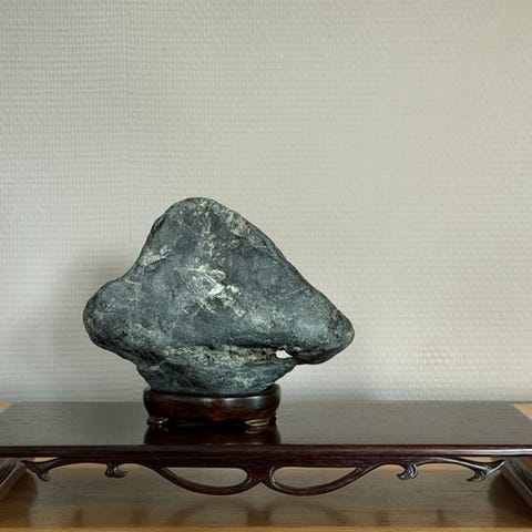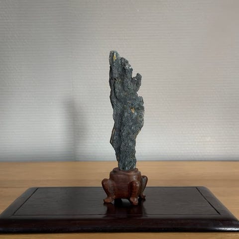 Suiseki naturligt på alle sine sider, inklusive basen; dets daiza af kvalitet er signeret af kunstneren.