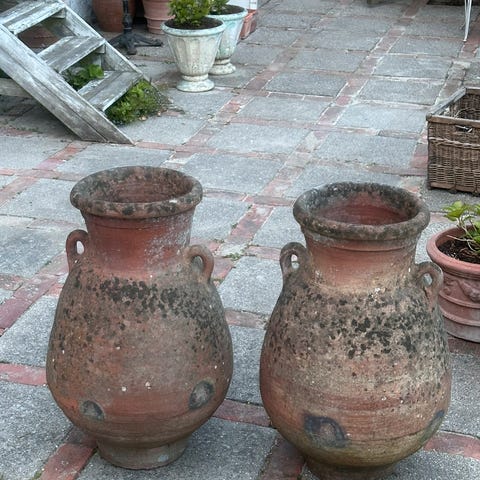 Store citrusvaser af terracotta, hånddrejet, fra Deruta i Umbrien, anslået periode 2000–2010, cirka 45 cm højde og 60 cm bredde. Klik på den blå "gå til varen" knap, for at købe eller byde på denne vare. Den samlede pris vil blive vist inden du afgiver dit bud.