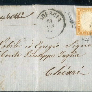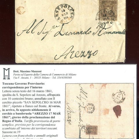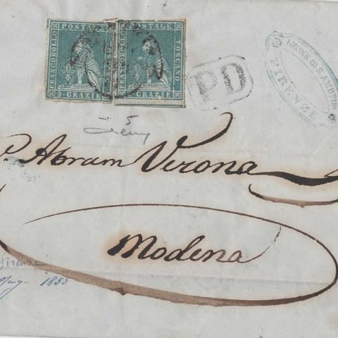 Et komplet brev med tekst fra Firenze til Viterbo den 28. november 1954, frankeret med taksttypen 'Lega' for tredje afstand med 6 crazie, 1. emission 'mørk grå'. På forsiden stempel 'PD' til validering af taksten; på bagsiden stempel fra Acquapendente for indrejse i Den Pontifikale Stats. Dokumentet er meget frisk og frimærket vel margineret på alle fire sider. Et samlet stykke af høj kvalitet. Certifikat M. Manzoni. Katalog € 2000,00+.
