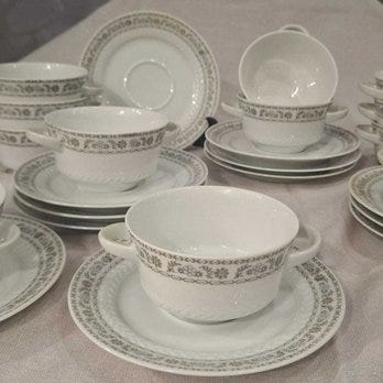 Komplet bordservice til 12 personer, fremstillet af den prestigefyldte tyske fabrik PMR Bavaria Jaeger & Co. mellem midten og slutningen af det tyvende århundrede.