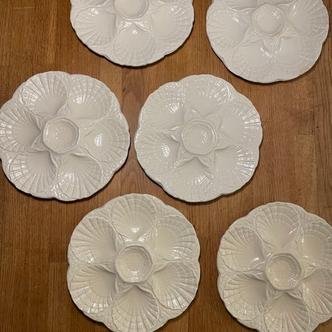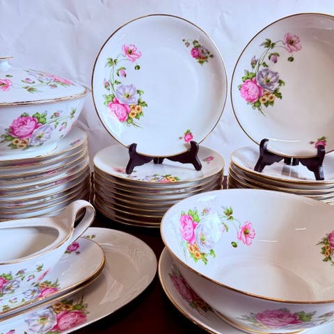 Smukt sæt på 18 porcelæns tallerkener fra Maison d'Orient Bruxelles med en raffineret og tidløs dekoration.