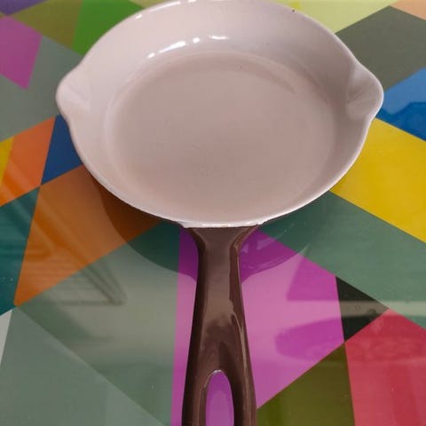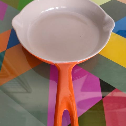 Pande fra Le Creuset i emaljeret støbejern, ny og fra årene 2000-2010. Velegnet til brug på alle varmekilder og i ovnen. Ideel til en person. Til spejlæg eksempelvis eller til at brune et stykke kød og færdiggøre tilberedningen i ovnen.