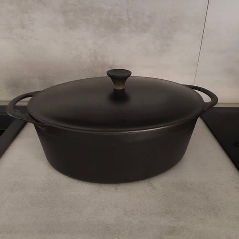 Oval cocotte, Le Creuset Cousances nummer 16. I groft støbejern, til alle varmekilder og ovn, ideel til braisering og simre af en god lille ret i god stand.