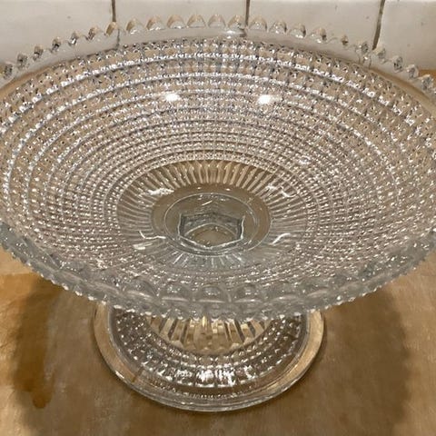 Form: stort plateau med festonneret/buet kant (kant scalloped), centralt tulipé- eller støbt balustre-fod, centralt strålemønster (roset eller støbt sol). Teint gennemskinnelig mauve-lilla nuance med subtile reflektioner, elegant og sjælden.