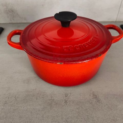 Et af håndtagene har en lille skærv i emaljen. Dette påvirker ikke brugsfunktionen af cocotte og kan renoveres ved hjælp af passende emalje, men udgør en let æstetisk fejl at tage i betragtning.