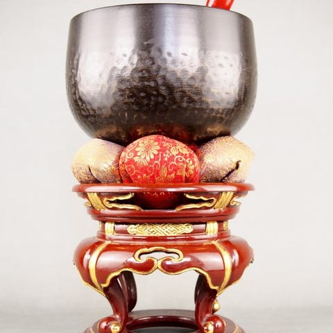 Original butsudan fra sent Shôwa-periode i Japan, sort og mørkerød lakeret træshytte med forgyldt indre, 158 cm høj, 121 cm bredt (åbne døre) og 58,5 cm dyb, udformet til tre votive figurer, med to skuffer, ydre sorte døre med gyldent gitter og røde indersider med gyldne kartuser, et ægthedscertifikat følger med forsendelsen; tilstand meget god med brugstegn og nogle indre ornamenter mangler. Klik på den blå "gå til varen" knap, for at købe eller byde på denne vare. Den samlede pris vil blive vist inden du afgiver dit bud.