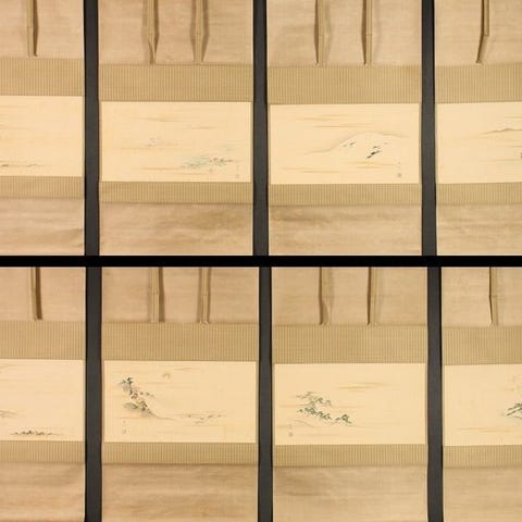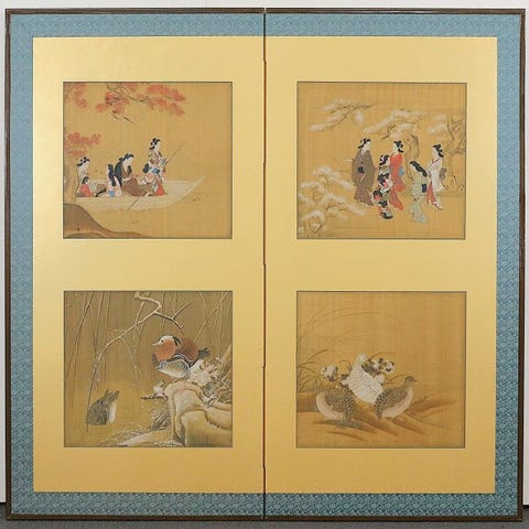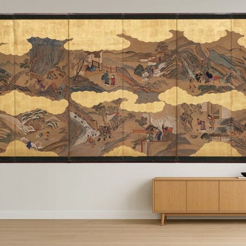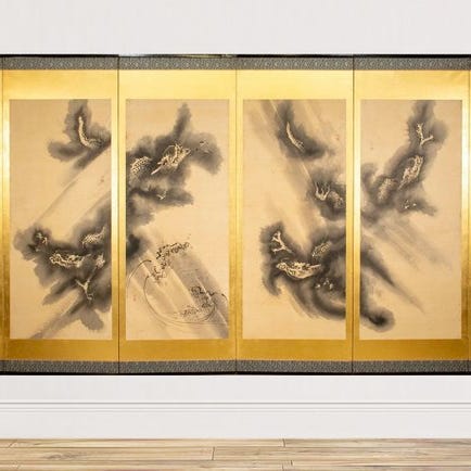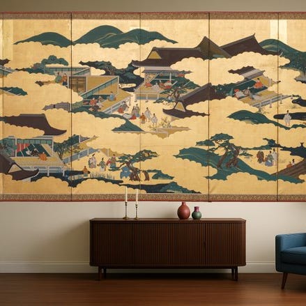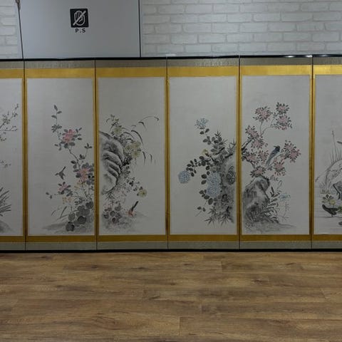 Et højt og markant seks-panelers byôbu 屏風 (foldescreen) malet med et forårslandskab, sat på en bund af gyldent sølvblad, der har fået en tiltrækkende, blidt aldrende patina.