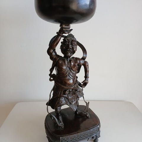 Bronze skulptur fra Japan fra Meiji-perioden (1890), kaldet Signed, der forestiller en liggende figur i flydende dragt, mål 15 × 11 × 4 tommer, underskrevet ved basen og leveret med fodstativ, i fremragende stand. Klik på den blå "gå til varen" knap, for at købe eller byde på denne vare. Den samlede pris vil blive vist inden du afgiver dit bud.