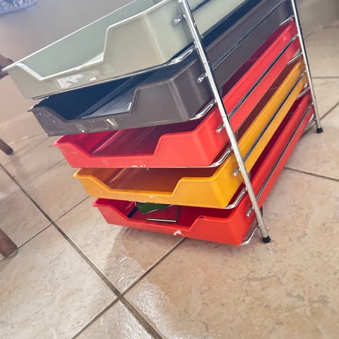 Små hylder i flere størrelser og forskellige lilla nuancer. Bordene er lavet i træ og har et moderne design.
