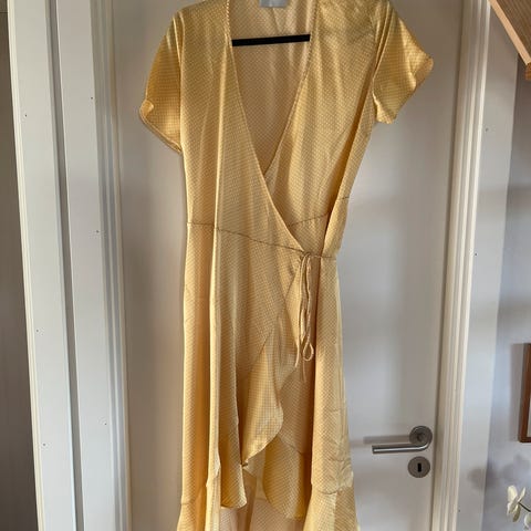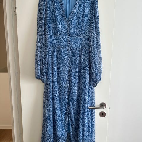 Flot slå-om kjole fra Neo Noir med længde til skinnebenet og flæsekant. Kjolen har korte ærmer og bindebånd i taljen med slå-om effekt. Fine råhvide prikker på marineblå bund. Brugt et par gange, som ny. Np 599 kr., sælges for 200 kr. pp