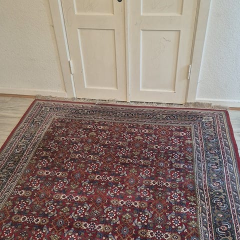 Tæppet er lavet i 100 % ren kamgarnsuld og har et klassisk persisk-inspireret mønster i blå nuancer.