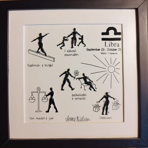 Anna Nielsen Stjernetegn Plakater i ramme med illustrationer af stjernetegnene Vægten, Libra, Vandmanden og Aquarius. Plakaterne indeholder beskrivelser af stjernetegnene på både dansk og engelsk. Rammerne er kvadratiske og har en sort kant. Begge to