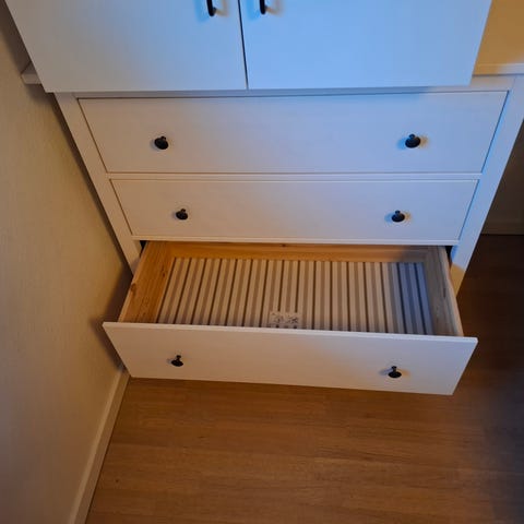 Fuld funktionel kommode. Gode skuffer. Enkelte brugsspor på toppladen. Der er billede af største slidmærke.