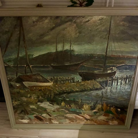 Olie på træplade. Signeret og indrammet. Rammemål cirka 77 x 52 cm. Plademål cirka 64 x 45 cm. Kan sendes med GLS til en pakkeshop for 53 kroner.